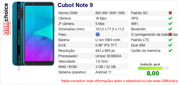 Dados sobre o telemóvel Cubot Note 9 na sua página