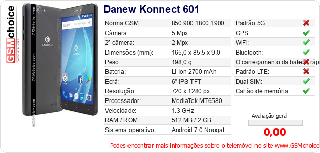 Dados sobre o telemóvel Danew Konnect 601 na sua página