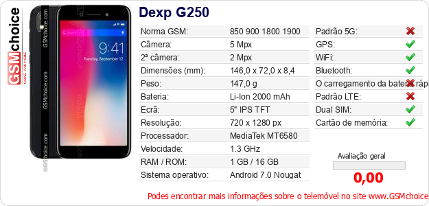 Dados sobre o telemóvel Dexp G250 na sua página