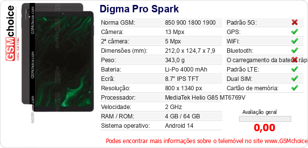 Dados sobre o telemóvel Digma Pro Spark na sua página