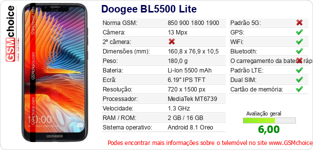Dados sobre o telemóvel Doogee BL5500 Lite na sua página