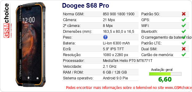 Dados sobre o telemóvel Doogee S68 Pro na sua página
