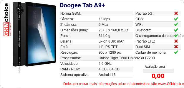 Dados sobre o telemóvel Doogee Tab A9+ na sua página