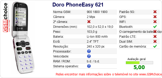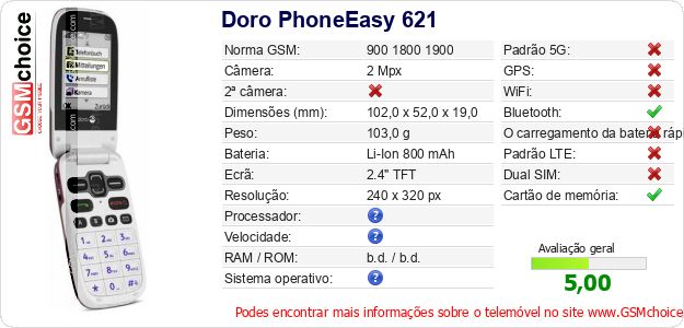 Dados sobre o telemóvel Doro PhoneEasy 621 na sua página