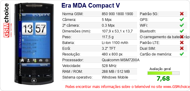 Dados sobre o telemóvel Era MDA Compact V na sua página