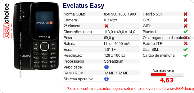 Dados sobre o telemóvel Evelatus Easy na sua página