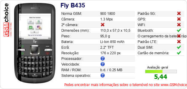 Dados sobre o telemóvel Fly B435 na sua página