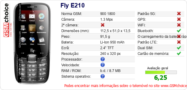 Dados sobre o telemóvel Fly E210 na sua página