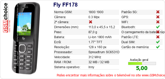 Dados sobre o telemóvel Fly FF178 na sua página