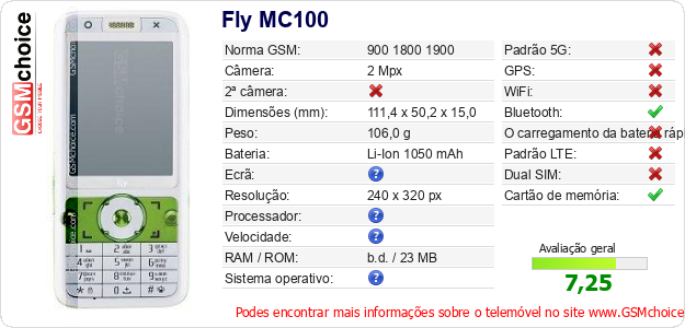 Dados sobre o telemóvel Fly MC100 na sua página