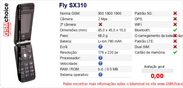 Dados sobre o telemóvel Fly SX310 na sua página