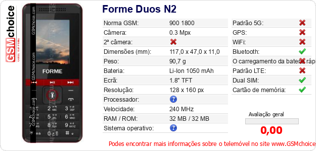 Dados sobre o telemóvel Forme Duos N2 na sua página
