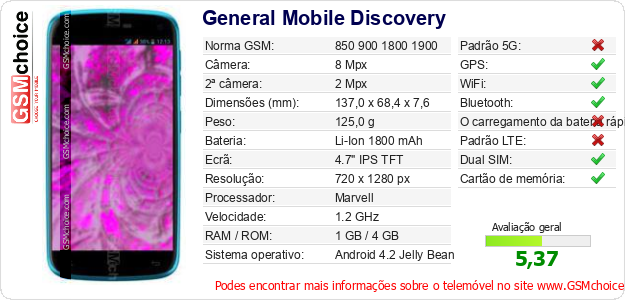 Dados sobre o telemóvel General Mobile Discovery na sua página