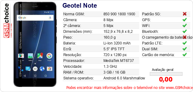 Dados sobre o telemóvel Geotel Note na sua página