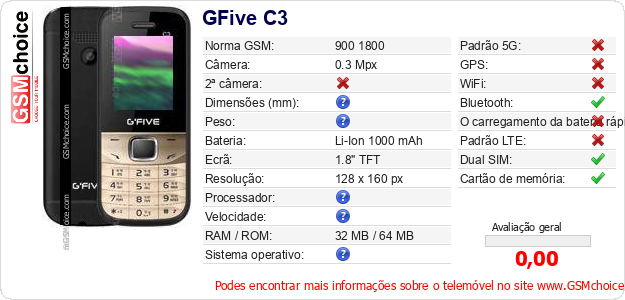 Dados sobre o telemóvel GFive C3 na sua página