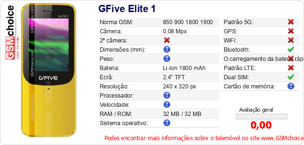 Dados sobre o telemóvel GFive Elite 1 na sua página