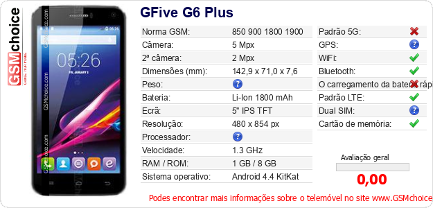Dados sobre o telemóvel GFive G6 Plus na sua página