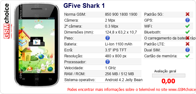 Dados sobre o telemóvel GFive Shark 1 na sua página