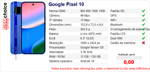 Dados sobre o telemóvel Google Pixel 10 na sua página
