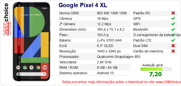 Dados sobre o telemóvel Google Pixel 4 XL na sua página