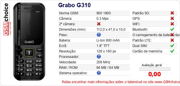 Dados sobre o telemóvel Grabo G310 na sua página