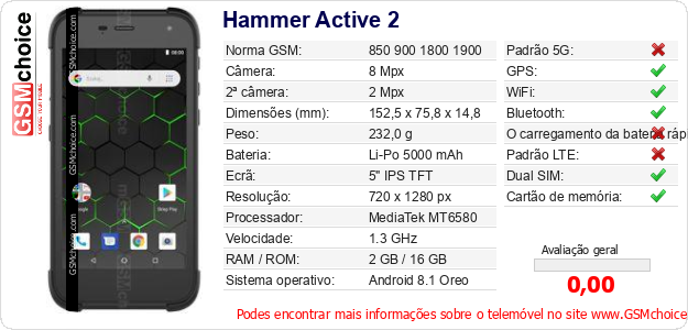 Dados sobre o telemóvel Hammer Active 2 na sua página