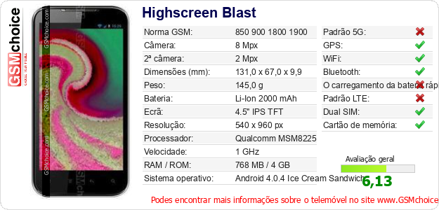 Dados sobre o telemóvel Highscreen Blast na sua página