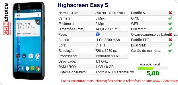 Dados sobre o telemóvel Highscreen Easy S na sua página