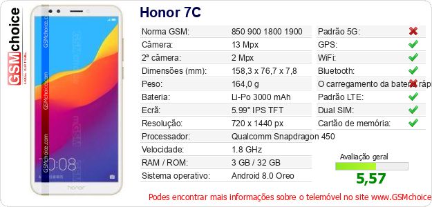 Dados sobre o telemóvel Honor 7C na sua página