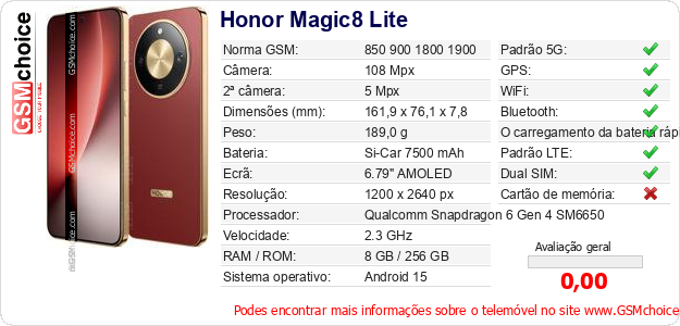 Dados sobre o telemóvel Honor Magic8 Lite na sua página