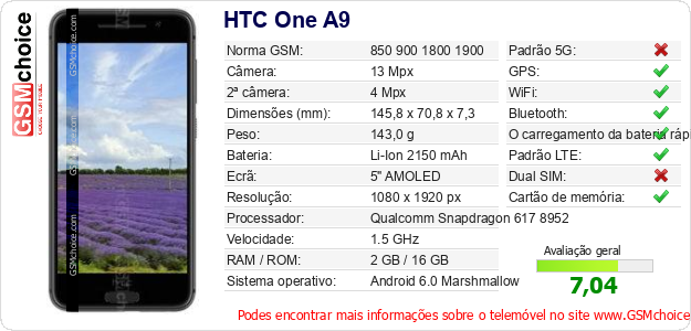 Dados sobre o telemóvel HTC One A9 na sua página