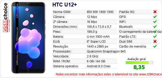 Dados sobre o telemóvel HTC U12+ na sua página