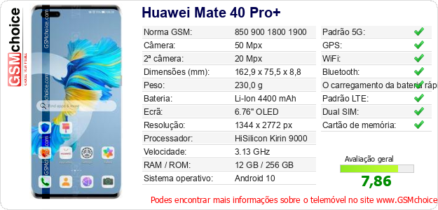 Dados sobre o telemóvel Huawei Mate 40 Pro+ na sua página