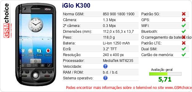 Dados sobre o telemóvel iGlo K300 na sua página