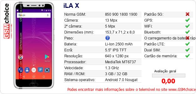 Dados sobre o telemóvel iLA X na sua página
