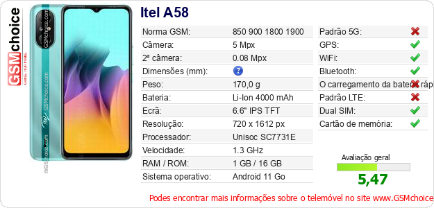 Dados sobre o telemóvel Itel A58 na sua página