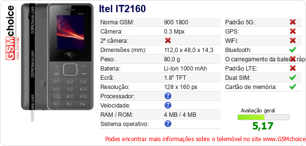 Dados sobre o telemóvel Itel IT2160 na sua página
