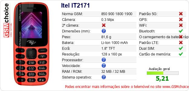 Dados sobre o telemóvel Itel IT2171 na sua página