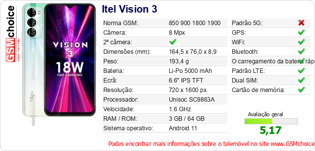 Dados sobre o telemóvel Itel Vision 3 na sua página