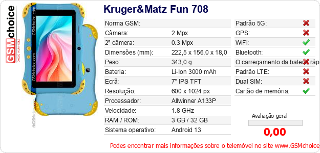 Dados sobre o telemóvel Kruger&Matz Fun 708 na sua página