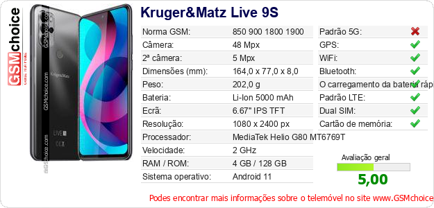 Dados sobre o telemóvel Kruger&Matz Live 9S na sua página