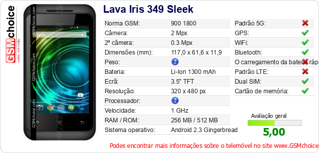 Dados sobre o telemóvel Lava Iris 349 Sleek na sua página