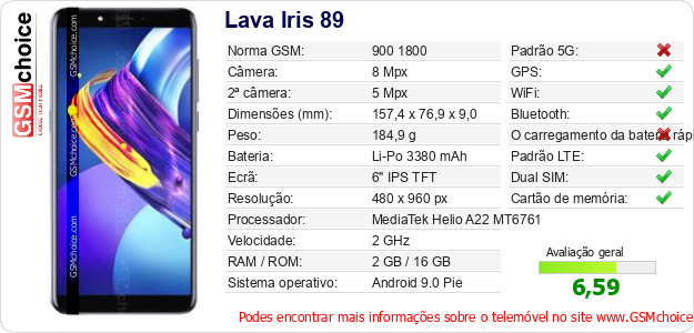 Dados sobre o telemóvel Lava Iris 89 na sua página