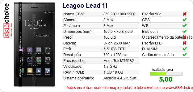 Dados sobre o telemóvel Leagoo Lead 1i na sua página