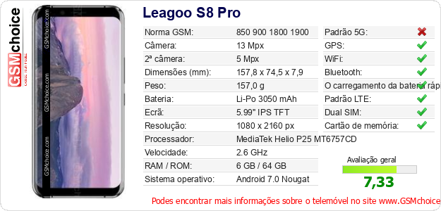 Dados sobre o telemóvel Leagoo S8 Pro na sua página