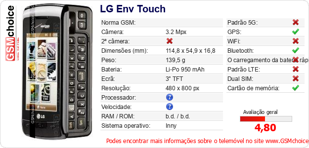 Dados sobre o telemóvel LG Env Touch na sua página