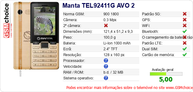Dados sobre o telemóvel Manta TEL92411G AVO 2 na sua página