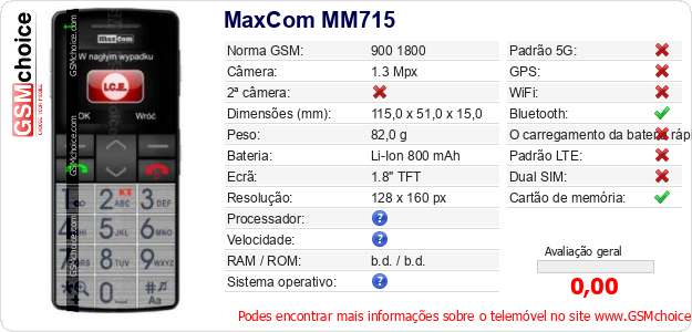 Dados sobre o telemóvel MaxCom MM715 na sua página