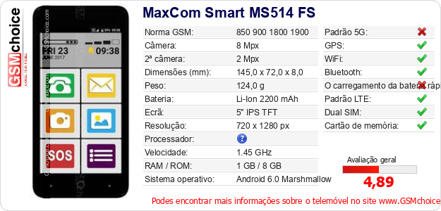 Dados sobre o telemóvel MaxCom Smart MS514 FS na sua página