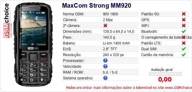 Dados sobre o telemóvel MaxCom Strong MM920 na sua página